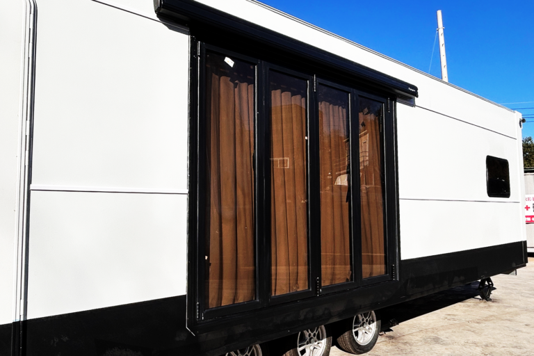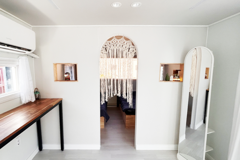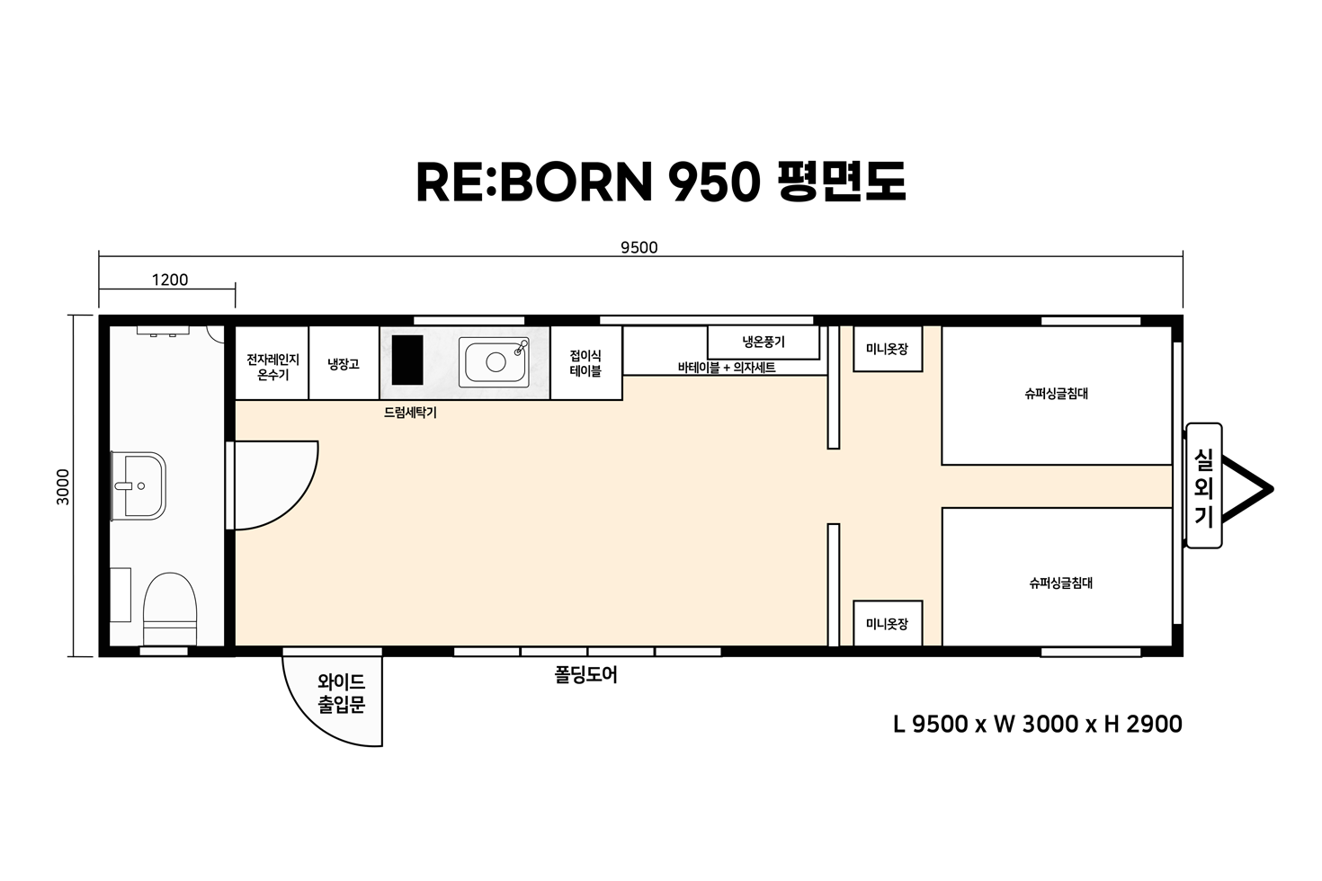 리본950S+는 폭이 약3m, 전장이 약 9.5m, 실내높이 2m20cm로 침실과 다이닝 공간, 욕실로 구분되어 있습니다. 침실에는 2개의 슈퍼싱글침대, 2개의 미니옷장, 전면 대형 고정창과 2개의 카라반 창문이 있어 채광 및 환기가 탁월합니다. 다이닝 공간에는 4단 폴딩도어와 바테이블 공간이 있어 상황과 환경에 맞게 여유로운 시간을 즐길 수 있습니다. 상하부장이 포함된 씽크대와 접이식 테이블, 각종 주방기기(냉장고, 전다레인지, 인덕션)를 통해서 간단한 식사도 해결할 수 있습니다. 욕실에는 세면대, 해바라기수전, 변기, 수납장이 포함되어 있어 외부 시설만 연결하면 가정용 욕실로 사용하는 것과 동일하게 사용하실 수 있습니다.